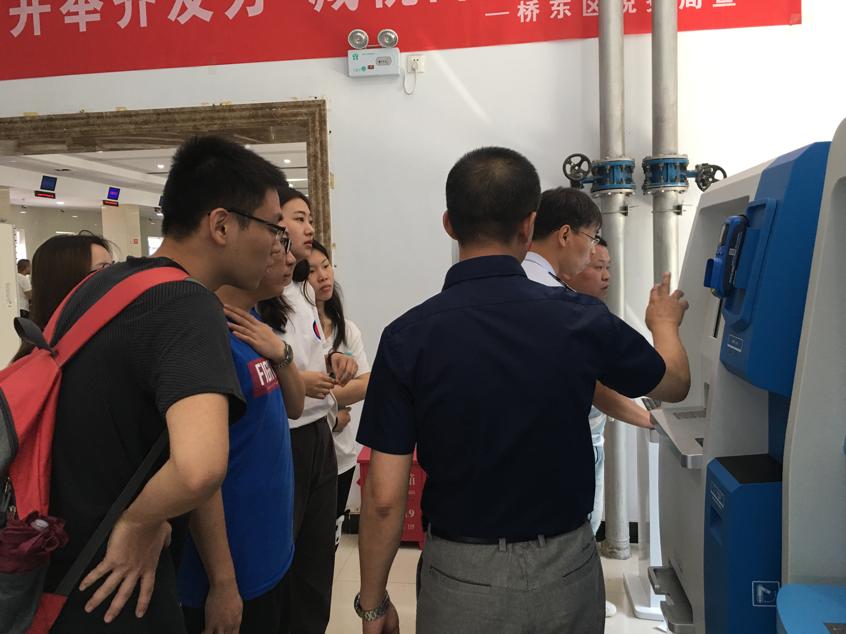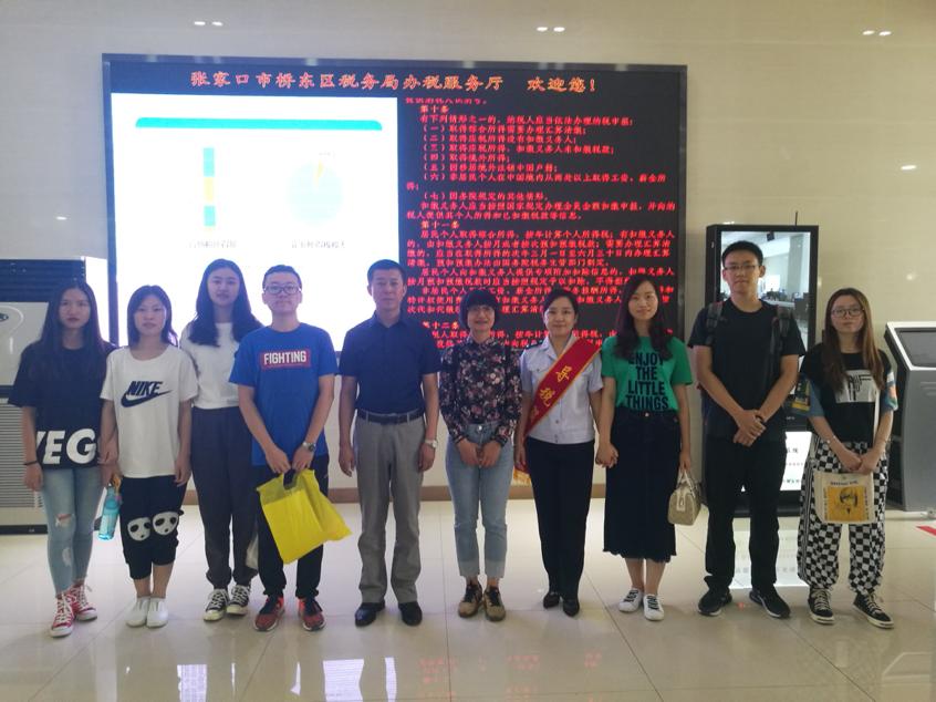 7月8日上午,由解建立和刘献灿二位老师带领的税务调研小分队参观了张家口市办税服务大厅。此次参观我们主要学习了纳税服务大厅的布局建设和纳税服务的工作流程,并且由调研小分队分发放纳税服务满意度调查问卷,了解当地纳税人对纳税服务的建议和意见。