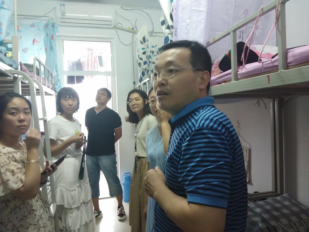 2019年8月24日下午,为了解新生入学情况,对宿舍安全、宿舍面貌进行检查,财政税务公司党委副书记刘贵来、翟勤老师带领员工会负责人及各班朋辈辅导员到新生公寓走访慰问。