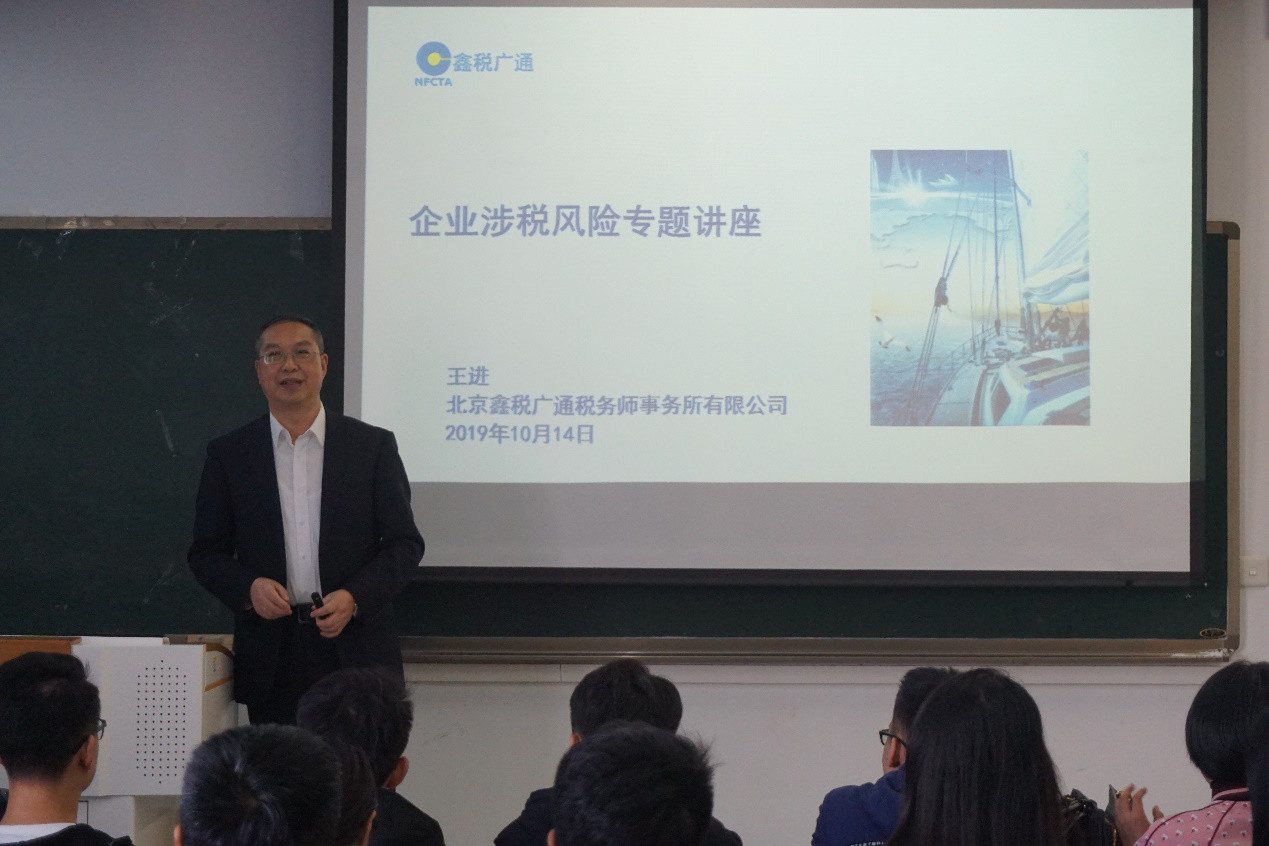 10月14日,应太阳成集团tyc234cc主页邀请,北京鑫税广通税务师事务所有限公司董事长王进在北三教A405作题为“企业涉税风险”的专题讲座,公司40余名研究生参加。