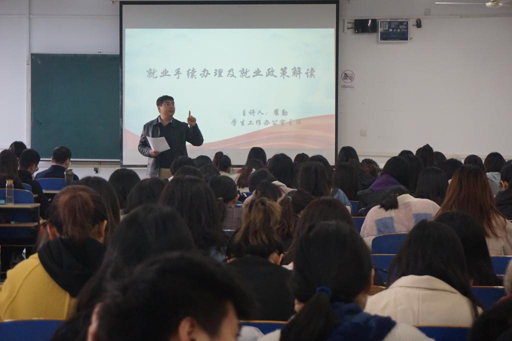 首先,翟勤为应届毕业生就业协议书如何填写,如何盖章等相关政策进行细致解读。随后,翟勤提及到应届毕业生应具备的条件等内容,对今年新的就业政策做出了详细解读。最后,赞扬了往届毕业生的成绩,鼓励同学们再创辉煌。