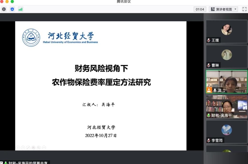 通过听取吴老师的汇报,老师们就费率厘定进行了热烈并友好的交流。此次“财务风险视角下农作物保险费率厘定方法研究”主题的教学沙龙活动,旨在从财务风险视角让老师们对农业保险费率的厘定方法有所启发,增强财政与其他学科的交叉提升,助力公司“双一流”建设具有一定启发意义。(撰稿:吴海平,摄影:翟亚宁 )