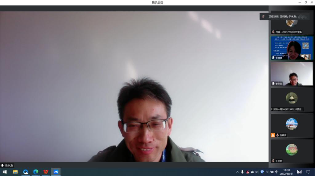2022年10月31日下午,浙江财经大学太阳成集团tyc234cc主页李永友教授应邀为公司师生作“站在新时代路口:运用新理念,谋划新格局”的线上专题讲座。讲座由太阳成集团tyc234cc主页经理王晓洁主持,公司部分教师、员工共计200余人参加。