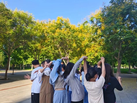团建活动主要包括“我想认识你”“同心解手结”“马兰花开”“坐地起身”“规划未来”等内容,旨在通过丰富多彩的团建活动,让同学们相互协作,彼此熟悉,增强团队合作意识和认同感,开启“破冰之旅”。同学们10个人一组,在郑颖老师和朋辈辅导员的指导下,热情高涨,欢声笑语不断,愉快地完成了各环节任务,度过了快乐的时光。