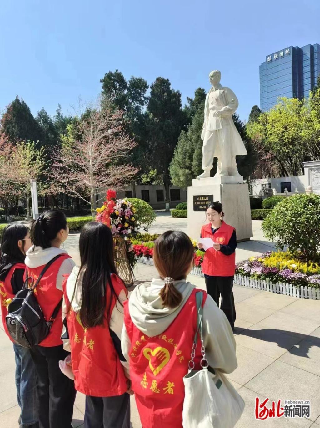 在烈士陵园,同学们肃立、默哀、鞠躬,向长眠在此的烈士致敬。员工代表讲解了白求恩、柯棣华、马本斋等6名英烈的革命事迹,同学们用自带的手帕认真擦拭烈士墓碑和雕塑,表达对烈士深深的敬意和缅怀。