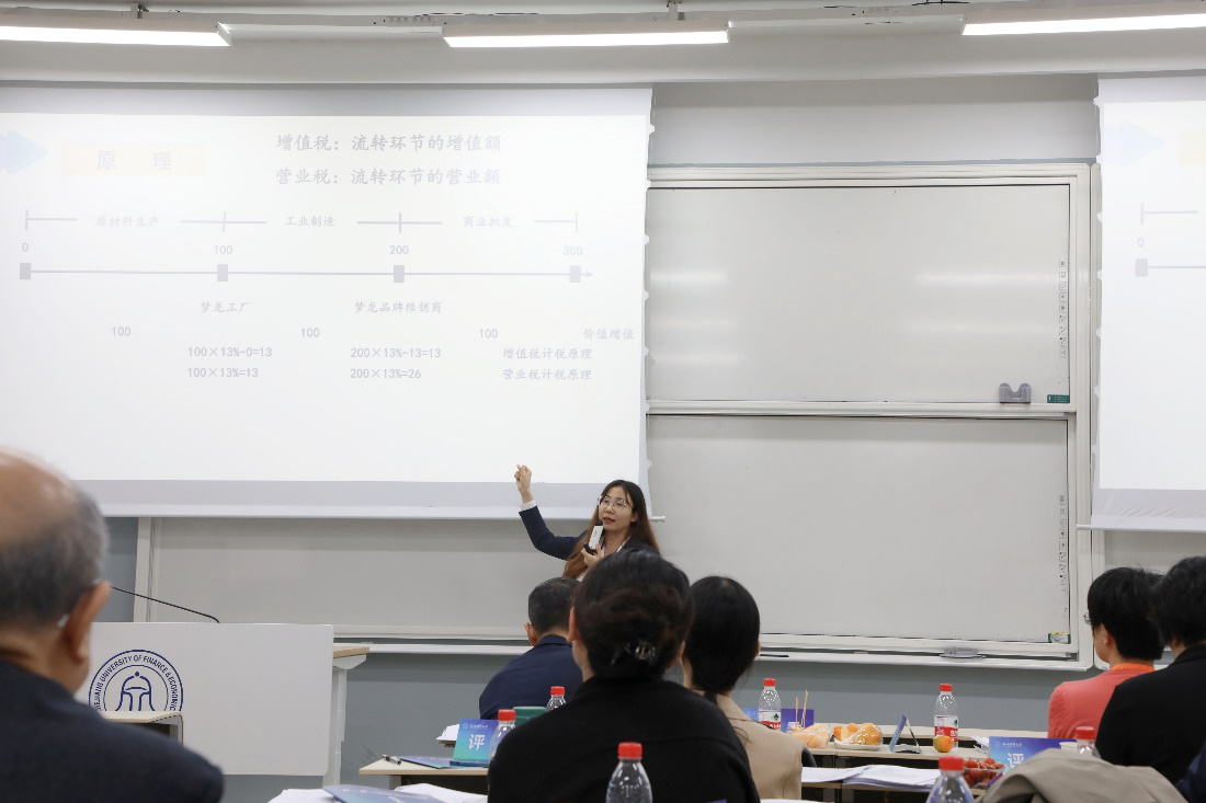 赵明洁老师结合数智时代的《中国税制》课程建设特点,从教学内容、教学方法、教学设计三方面,提出了思政育人的创新举措。在现场教学环节,赵明洁老师分别就《个人所得税专项附加扣除》以及《“营改增”改革》进行了课堂展示,获得在场评委的一致好评。
