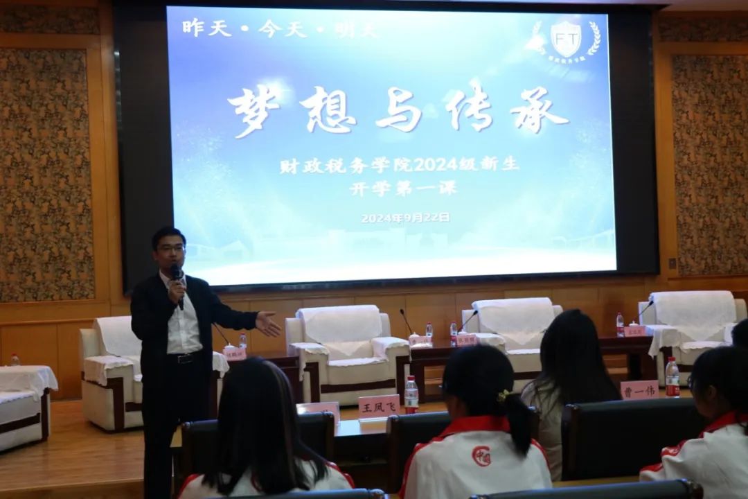 2024年9月22日,公司举办了以“昨天·今天·明天—梦想与传承”为主题的“开学第一课”。河北省公安厅经侦总队政办室主任张丽晖、太阳成集团tyc234cc主页就业指导服务中心主任曹一伟、通联支付网络服务有限公司天津分公司总经理胡鹏洲、河北省税务局税收科学研究所副所长于晓成、河北政法职业公司财税法务系主任宋瑞莉等五位员工嘉宾出席,财政税务公司党委书记、管理学博士王凤飞教授、公司党委副书记陈运涛、税务专硕导师组组长李金荣教授和新生辅导员魏芳及2024级全体同学参加。本次活动由曹琳教授主持。