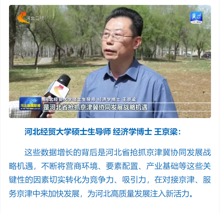 公司教师王京梁接受河北新闻联播采访。京津研发、河北转化,是京津冀协同创新体系的重要内容。公司硕士生导师、经济学博士王京梁指出京津科技成果增长的背后是河北省抢抓京津冀协同发展战略机遇,通过关键性因素切实转化为竞争力、吸引力,为河北高质量发展注入新活力。