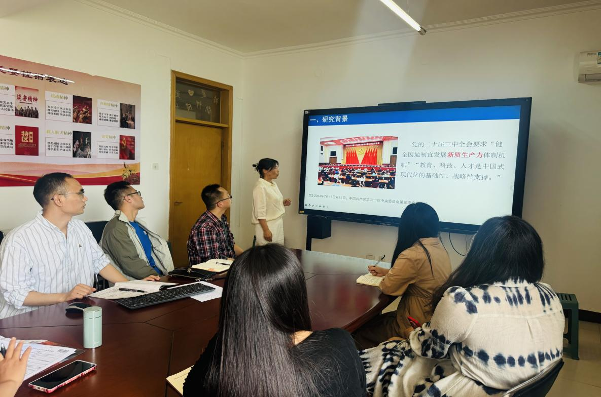此次活动中,李敬老师从新质生产力与高等教育协同发展的内在机制、现实挑战及实践路径等层面进行汇报。新质生产力是以科技创新为主导、以高质量发展为目标的新型生产力形态,高等教育作为人才培养和知识创新的主阵地,亟需构建与之相适应的协同发展机制。汇报人从新质生产力与高等教育协同发展的现实挑战切入,强调高校应坚持系统观念、协同创新、动态调整、对外开放,培养适应新质生产力需求的创新型人才。随后与参会老师关于新质生产力的评价指标、新质生产力与人文社科的价值重塑等问题展开热烈讨论。