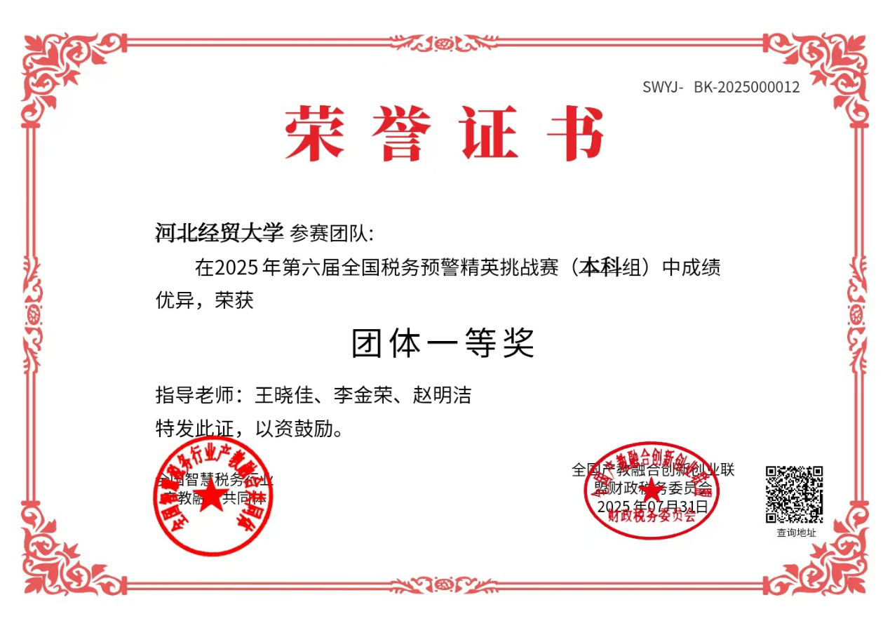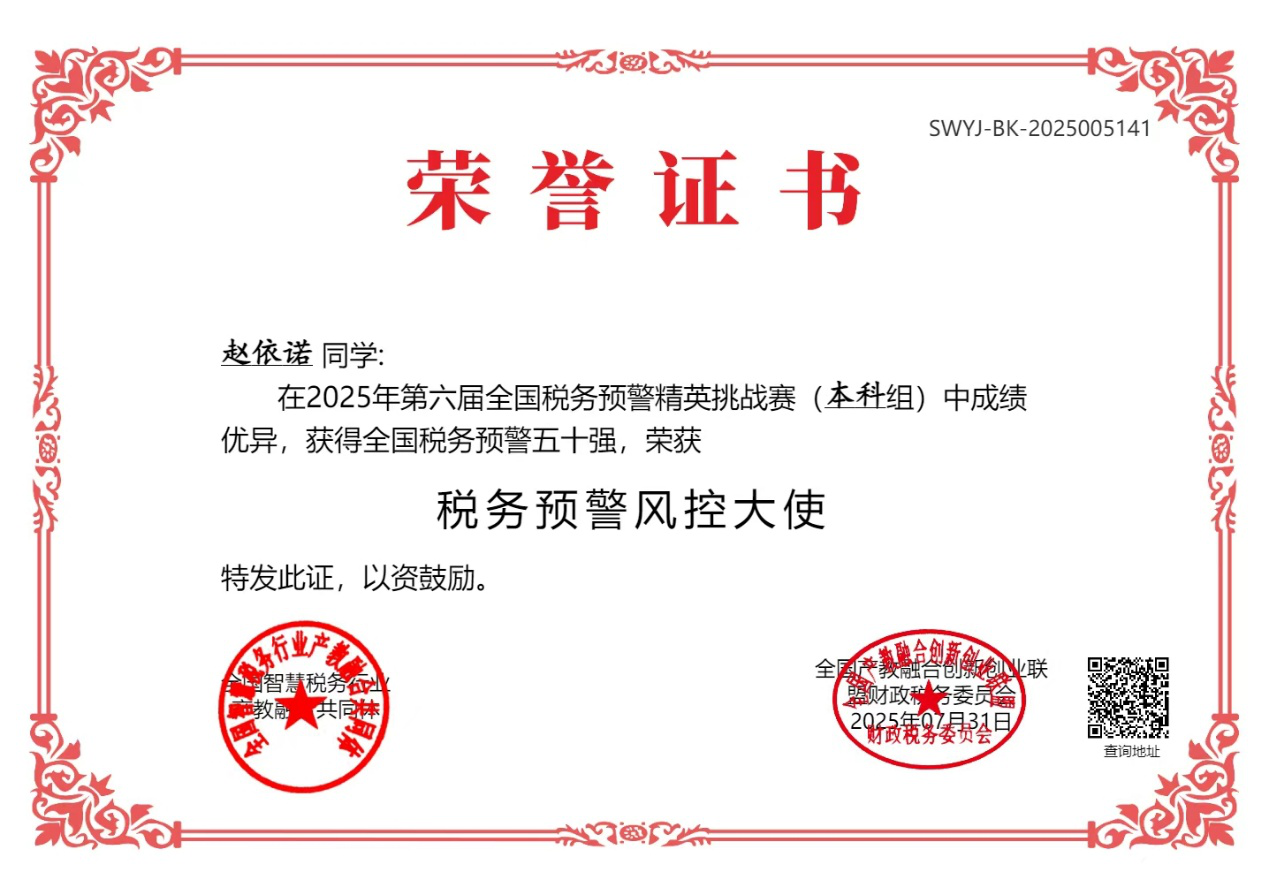 2025年7月,全国智慧税务行业产教融合共同体主办了第六届“衡信杯”全国税务预警精英挑战赛(本科院校赛道),共有来自全国124所本科院校的近5800名选手同场竞技,共同展现财税专业领域的知识储备与实践能力。通过系统培训、模拟演练等方式提升员工的专业素养。2025年7月7日至7月27日,通过连续21天的线上比赛,公司257名同学持之以恒地凭借扎实的专业功底和出色的临场发挥,最终脱颖而出,再次荣获团体赛一等奖,其中,2024级研究生赵依诺同学更是以优异的成绩跻身全国前50强并荣获税务预警风控大使,实现公司零的突破,充分展现了公司学子的卓越风采和专业水平!