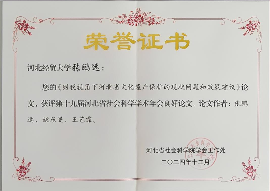 近日,公司教师张鹏远与中央财经大学姚东旻、王艺霏共同撰写的《财税视角下河北省文化遗产保护的现状问题和政策建议》,获得第十九届河北省社会科学学术年会良好论文。