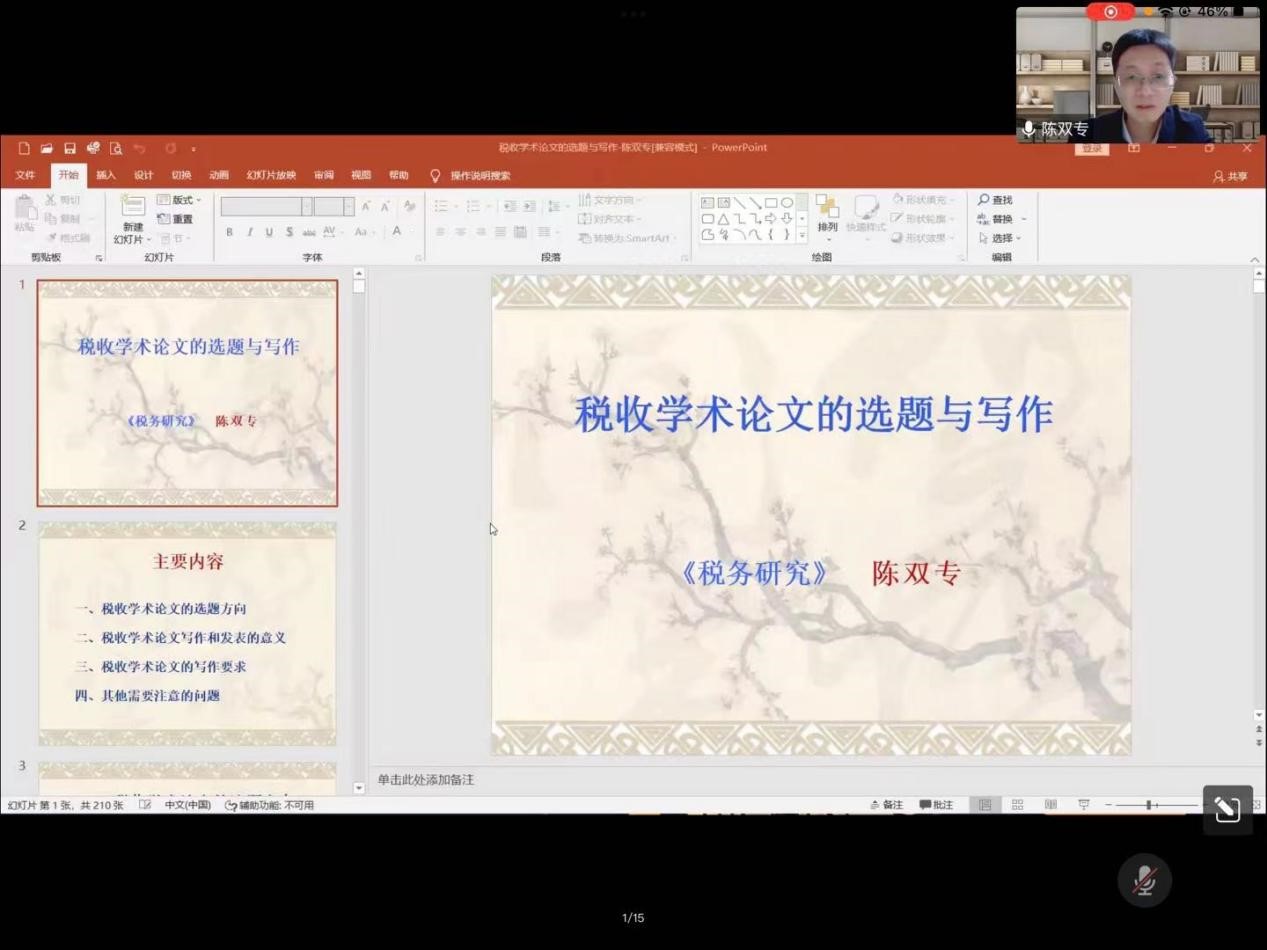 4月14日晚,《税务研究》杂志编辑部副主任陈双专应太阳成集团tyc234cc主页邀请,于线上作了题为“税收学术论文的选题与写作”的学术讲座。讲座由财税公司副经理仇晓洁主持,公司200余名师生参会。