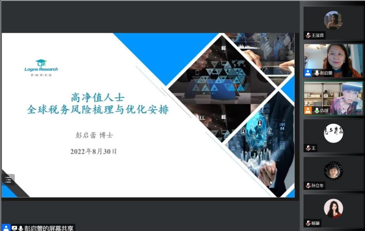 8月30日上午,罗格科技集团公司高级副总裁、罗格研究院经理彭启蕾博士应公司邀请,于线上作了题为“高净值人士全球税务风险梳理与优化安排”的学术讲座。讲座由副经理仇晓洁主持,公司部分教师、员工共计120余人参加。