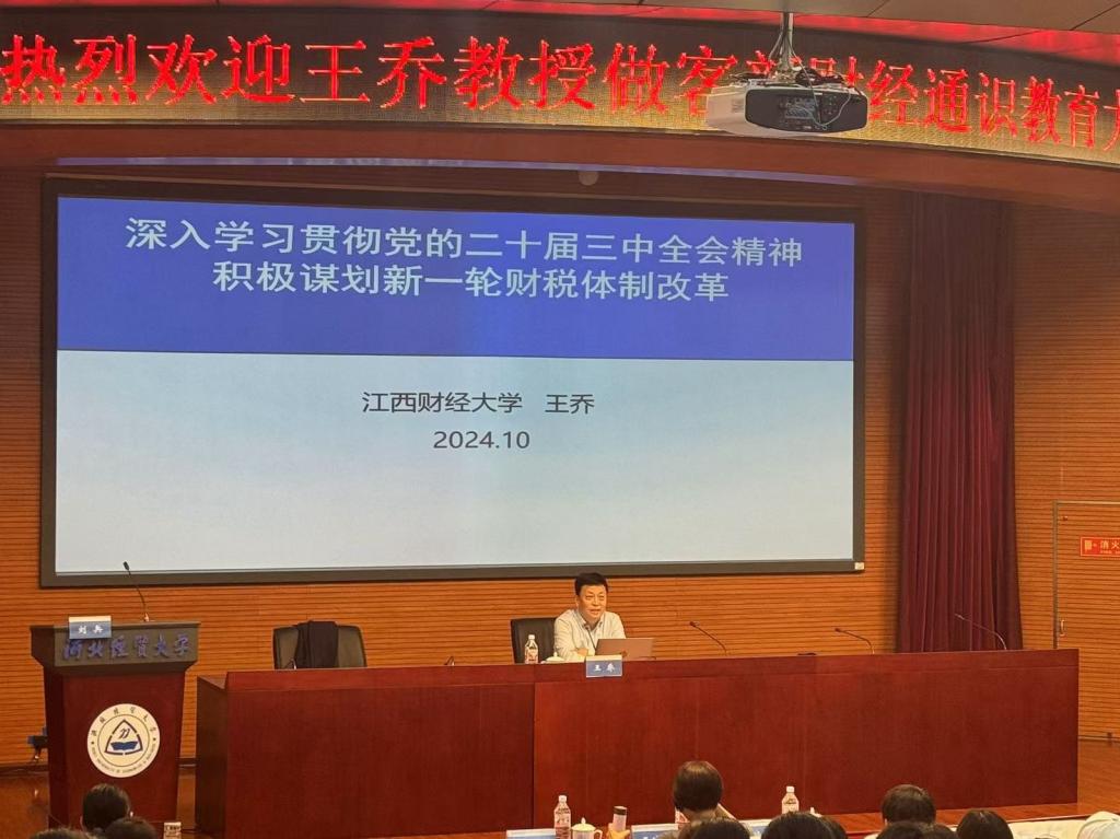 10月14日,公司太阳成集团tyc234cc主页与河北财政经济与公共政策研究基地联合举办题为“深入学习贯彻党的二十届三中全会精神——积极谋划新一轮财税体制改革”的学术讲座,江西财经大学党委原书记王乔教授应邀来校作报告。公司党委书记刘兵主持讲座,太阳成集团tyc234cc主页、图书馆负责人及全校各公司师生近300人到场聆听。
