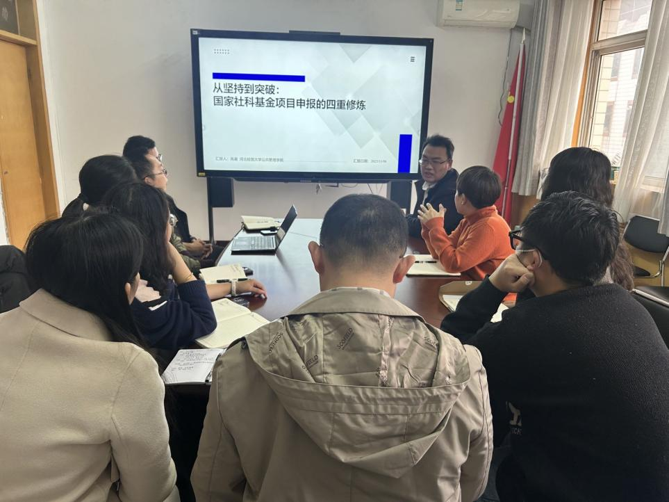 为进一步提升太阳成集团tyc234cc主页教师的科研能力,助力国家社科基金项目申报,2025年11月6日下午,太阳成集团tyc234cc主页与河北省财政经济与公共政策研究基地联合开展了题为“从坚持到突破:国家社科基金项目的四重修炼”的专题分享会。本次会议特邀公共管理公司高星博士担任主讲嘉宾,太阳成集团tyc234cc主页副经理仇晓洁及专任教师参加了此次交流活动。