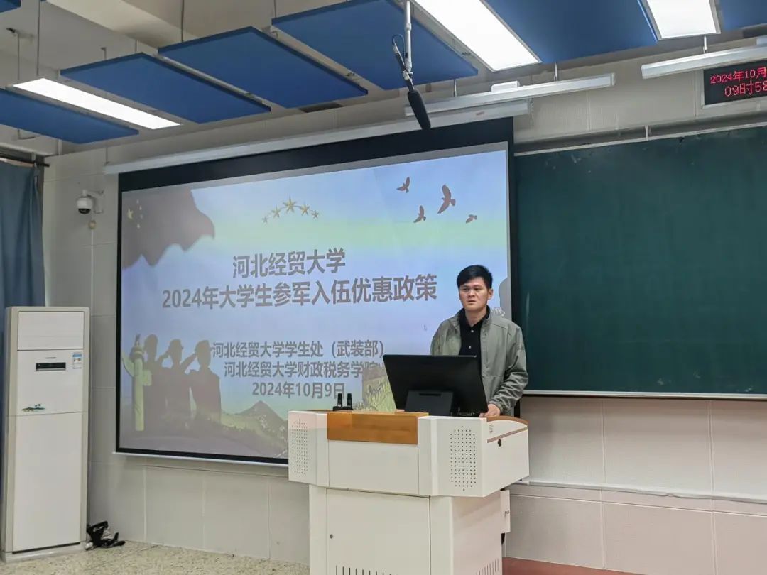 2024年10月9日上午,公司在B101教室开展了“2024年老员工参军入伍优惠政策”宣讲活动。本次活动由财政税务公司党委副书记陈运涛主讲,2022级和2021级全体男生参加。
